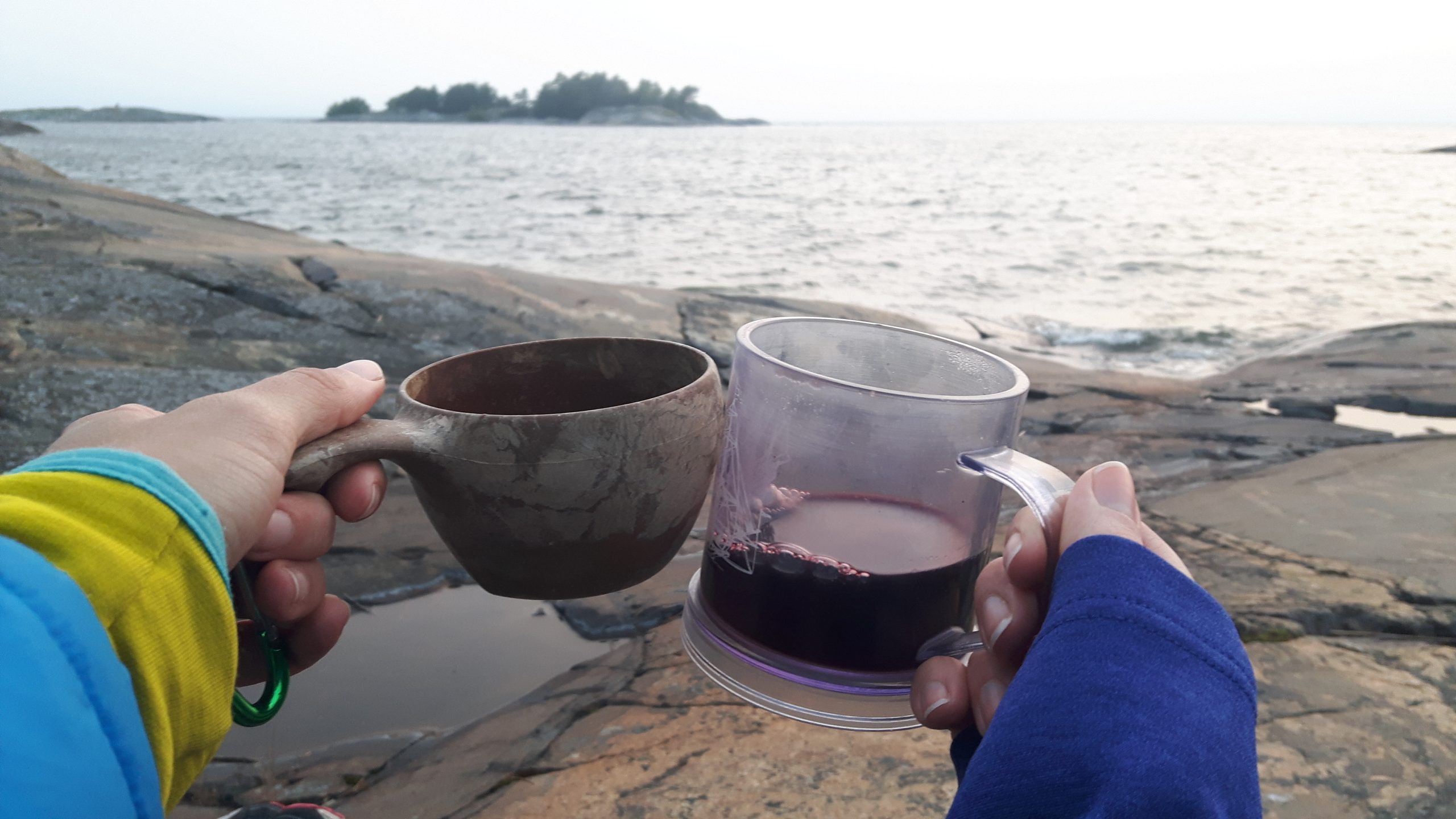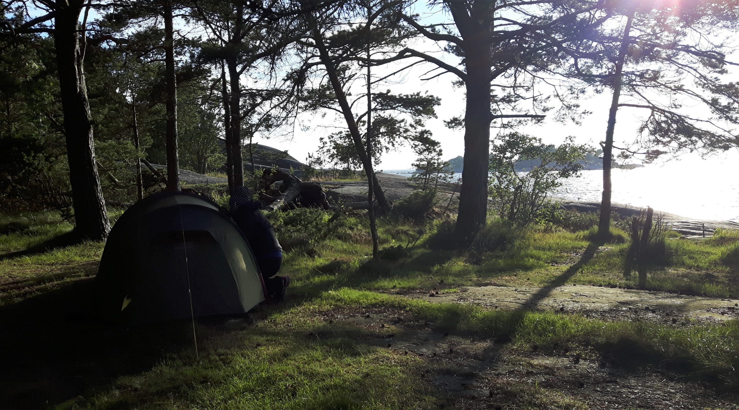 Autot jätettiin nyt jo tutulle parkkipaikalle Telegrafberget-kallioiden itäiselle puolelle ja kävelimme katselemaan maisemia niemenkärkeen, kiertäen koko Pamskatanin (Porkkalanniemen karttaan voit tutustua täällä). Makkarat grillattiin niemenkärjen tulipaikalla ja niemenkärkeä tutkiessamme etsittiin samalla yöksi sopivaa telttapaikkaa, joka löytyi Pamskatanin niemeen johtavan kapeikon länsipuolelta. Täältä avautuu kaunis maisema kohti Grållsgrundia, Upinniemenselkää ja ilta-aurinkoa. Ilta vietettiin höpisten, keitellen herkuttelijan jauhelihakastiketta Trangialla ja nauttien maisemista. Illalla niemenkärjen imaisi kevyt merisumu, joka oli aamuksi taas hälvennyt. Aamupalaa nautittiin myöhäisen heräämisen vuoksi oikeastaan brunssina, ilman sitten minkäänlaista kiirettä kotiin. Matkalla autolle poimittiin vielä polun varresta kesän ensimmäisiä mustikoita. Sanoisin että kaiken kaikkiaan tämä lyhyt retki oli hyvin onnistunut. 🙂