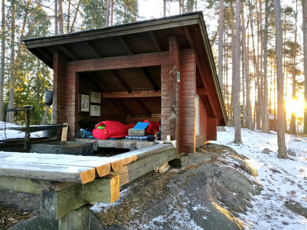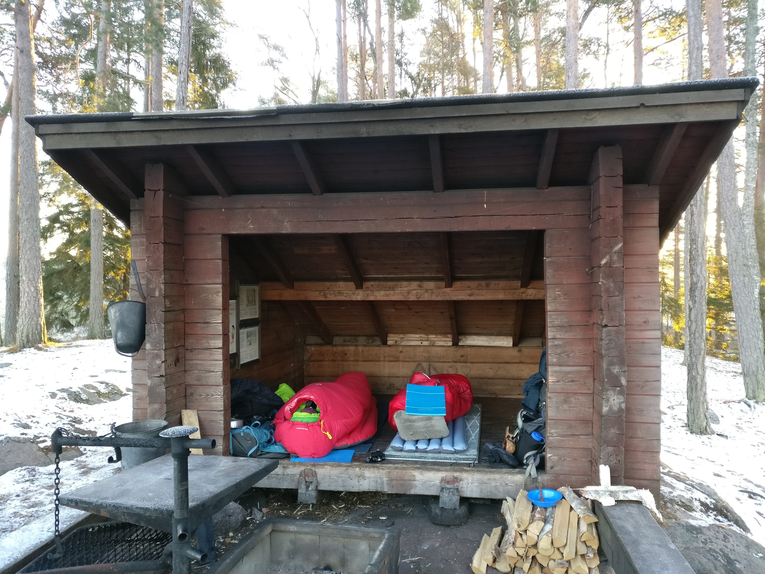 Laavu oli meidän onneksi tyhjä ja mahduimme hyvin siinä yöpymään. Ilta oli todella kylmä, -14c paikkeilla ja hämmästelin sitä, miten reipas kylmyys yllätti minut. Pitäydyin hyvin lähellä laavun edessä olevaa nuotiota, koska varpaat ja sormet jäätyivät äkkiä kun sen ääreltä siirtyi pois.