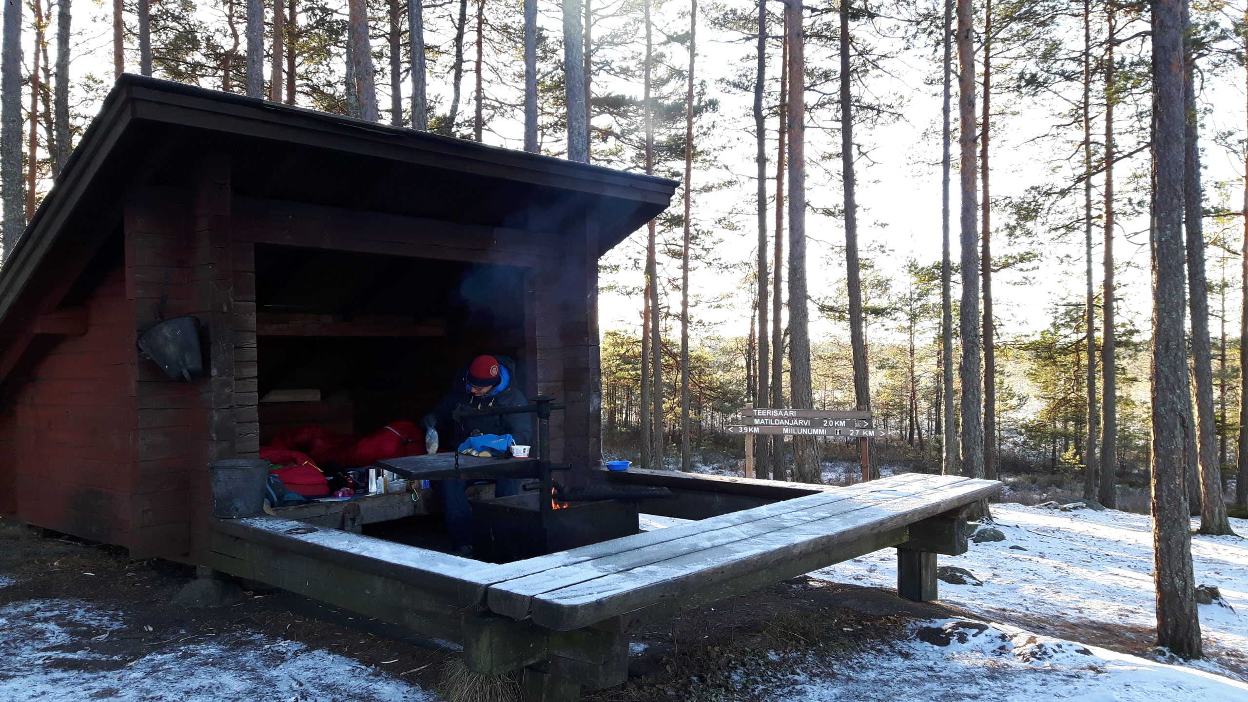 Me lähdimme itsenäisyyspäivää edeltävänä viikonloppuna kahdeksi yöksi Teijon kansallispuistoon. Sääennusteet lupasivat lauantai-yölle reippaita -12 asteen pakkaslukemia, jonka jälkeen sään ennustettiin lauhtuvan kunnolla. Pakkasin kotona huolellisesti lämmintä vaatetta ja yöpymisvarustetta mukaan, koska en halunnut palella tätä ensimmäistä kylmää yötä ulkona.
